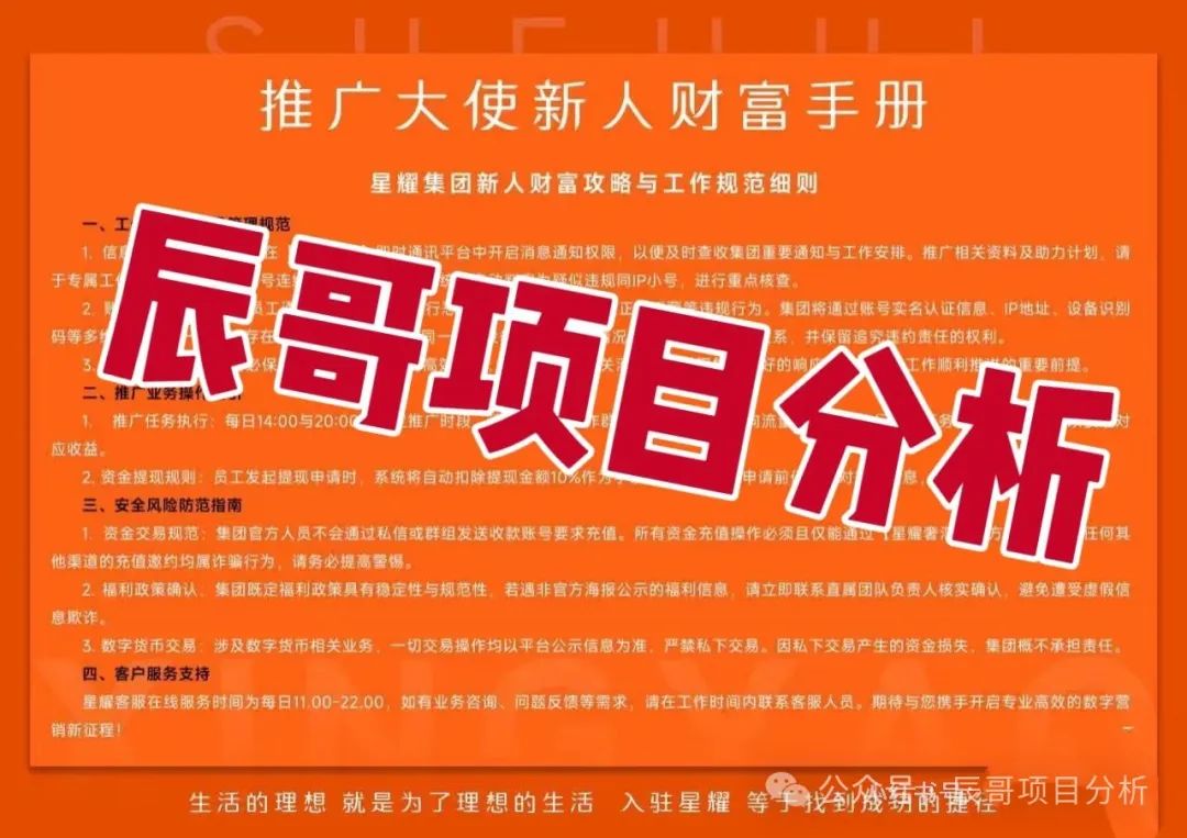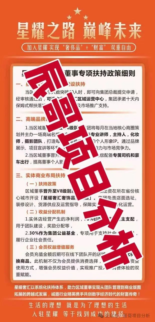 最近很多粉丝让辰哥曝光一下“星耀奢汇”,这盘子说什么“每天躺赚2%”“奢侈品赛道稳赚不赔”…作为踩过资金盘坑的人,辰哥今天必须给你们扒开它的真面目!这玩意儿根本不是投资,是“击鼓传花”骗局!号称“推广奢侈品分红”,但你细想:,以每日利润不超过2%为诱饵,比贩毒还暴利- 所谓“收益”全靠拉新人投钱,用后进来的本金给前面的人发“分红”,典型的庞氏骗局套路!之前爆雷的“南创资管”“顶峰商会”都是一个模子:先给点小甜头让你加仓,等没人接盘就直接关网跑路,几百人亲测血本无归!