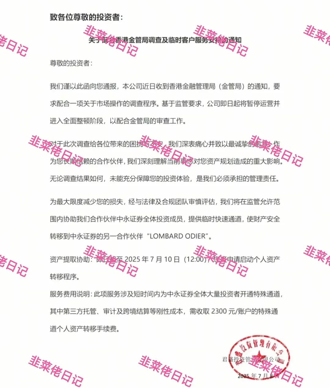 中国永昌:一个股票跟投类型的资金盘诈骗项目,现已不能提现,要求用户缴纳2300元账户资产转移费。平台称收到香港金融管理局通知,需配合调查,平台将暂停运营以配合工作,就是骗子自导自演的一场骗局,为了收割用户资金的一种手段。前言称要配合调查,后面就要你缴纳资金转移账户,这不明摆着想要逼人就范嘛,不缴纳资金就给你账户冻结有钱取不出,就算缴纳资金也不会让你取款到账,会有各种借口想办法让你再次交钱,毕竟心想着已经投资那么多进去,要是不继续就要亏那么多,万一就交最后一次钱就能提现了呢。