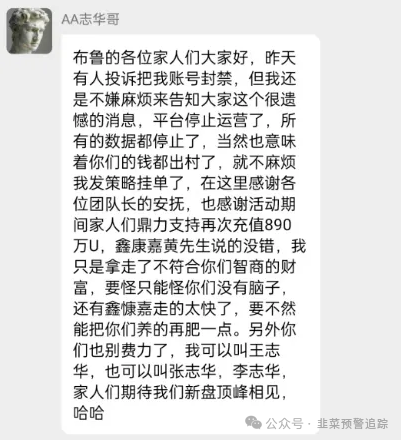 公告一出,群聊开始禁言删人,客服失联,提现失败无一例外。甚至于操盘手在用户群放话:“新盘顶峰相见,割的还是玩盘的韭菜。”有人开始报警,有人还在等下一次系统维护完毕。