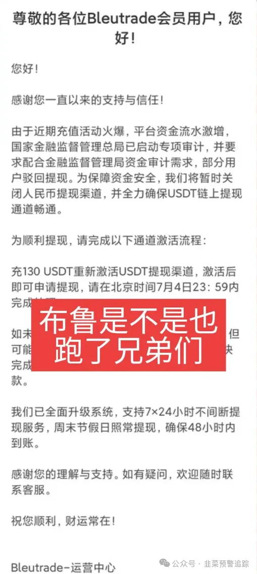 布鲁Bleutrade交易所最近发了一则公告,语气诚恳:因资金审计,USDT提现通道关闭,需要充值130USDT激活通道。还说系统会在三个月内自动激活,听起来像有理有据,但其实这就是跑路前的最后一刀。