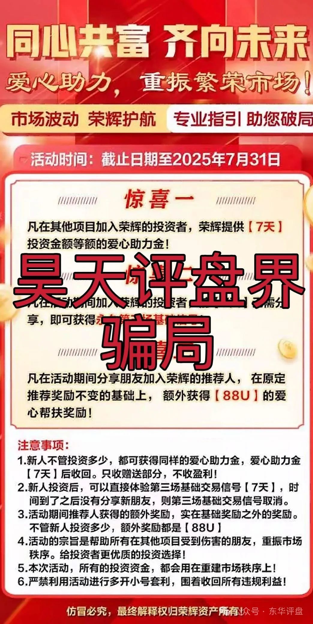 目前群里还在疯狂洗脑中,又推出了新的诈骗活动如下,大家千万不要信他们:在其他项目加入荣辉的投资者,荣辉提供【7天】投资金额等额的爱心助力金!在活动期间加入荣辉的投资者,前【7天】无需分享,即可获得永久第三场基础信号!在活动期间分享朋友加入荣辉的推荐人,在原定推荐奖励不变的基础上,额外获得【88U】的爱心帮扶奖励!注意事项:1新人不管投资多少,都可获得同样的爱心助力金,爱心助力金【7天】后收回。只收赠送部分,不收盈利!2新人投资后,可以直接体验第三场基础交易信号【7天】,时间到了之后没有分享新朋友,则第三场基础交易信号取消。3.活动期间推荐人获得的额外奖励,实在基础奖励之外的奖励。不管新人投资多少,额外奖励都是【88U】4.活动的宗旨是帮助所有在其他项目受到伤害的朋友,重振市场秩序。给投资者更优质的投资选择!5.本次活动,所有的投资资金,都会用在重建市场秩序上!6.严禁利用活动进行多开小号套利,围着收回所有违规利益!其实就是柬埔寨的狗推还没圈够任务数,又准备继续圈一波,看看隔壁的鑫康嘉的下场就知道了,现在诈骗团伙还让你去拉亲人玩你还能昧着良心去吗?二次收割只会被割的更惨: