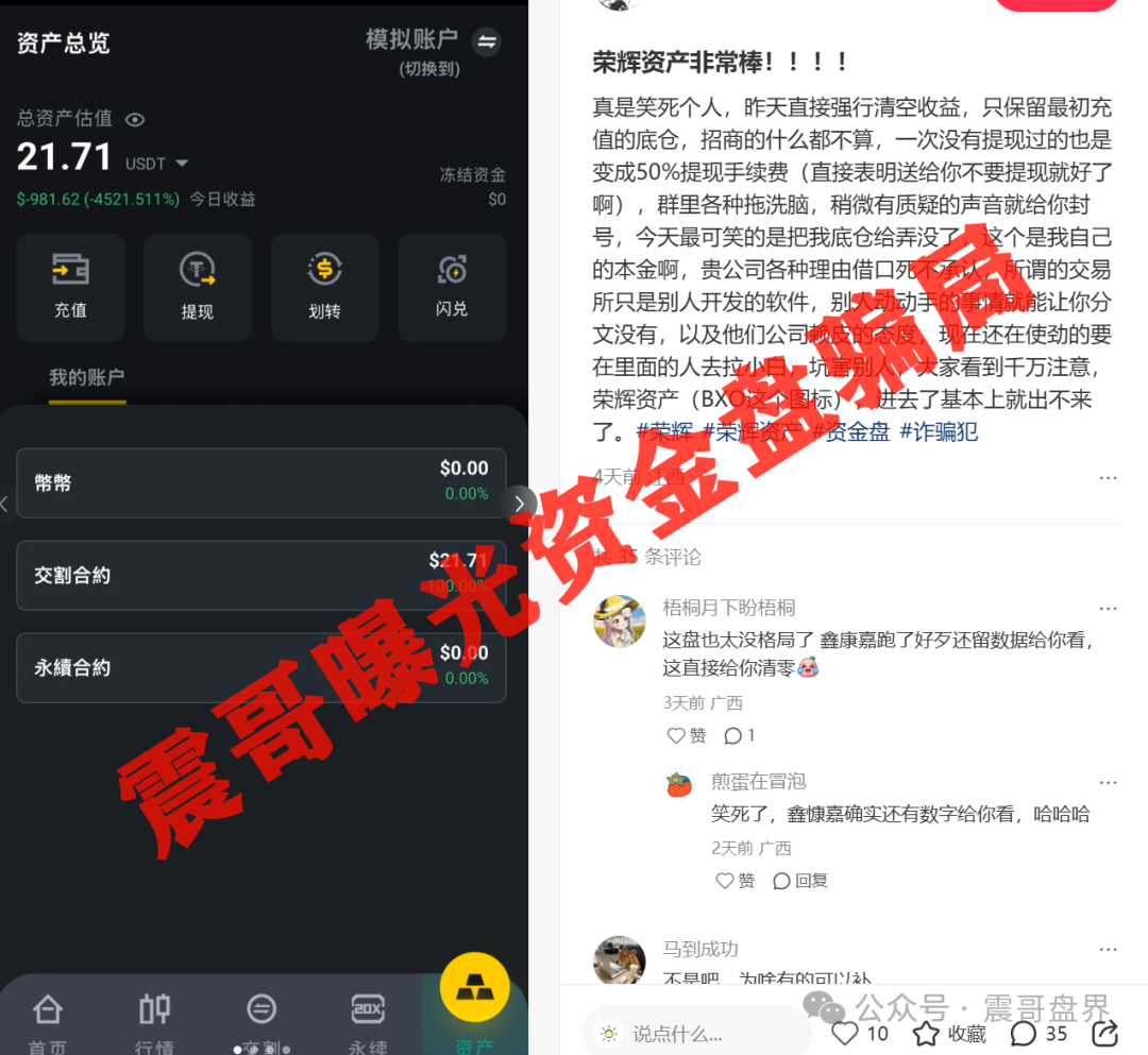 最近好多兄弟私信震哥,让扒一扒荣辉资产(BXO交易所)这个坑爹盘。这玩意儿就是个跟单类资金盘,和之前暴雷的鑫康嘉是同一伙骗子搞的。现在崩盘锁仓后,这帮人又玩重启,美其名曰“新盘”,其实就是拉新人填坑。