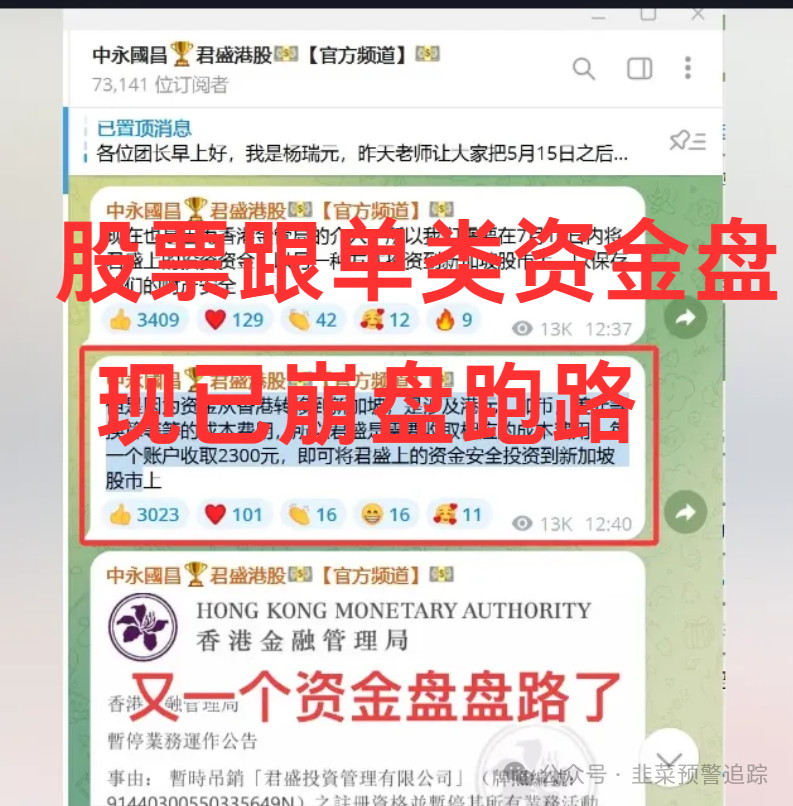 中永国昌股票跟单资金盘已崩盘跑路,昨日提现不到账,今日禁止提现,还忽悠投资者交 22300 成本费强制平移,虚构香港金管所介入,欲转移资金至新加坡并收取费用,这是明显的二次收割。此前网络上已有众多博主预警。被骗会员切勿交钱,有团队长带队的应报警维权。玩资金盘尤其是境外盘的朋友要保住本金,能退出的先观望,避免损失。