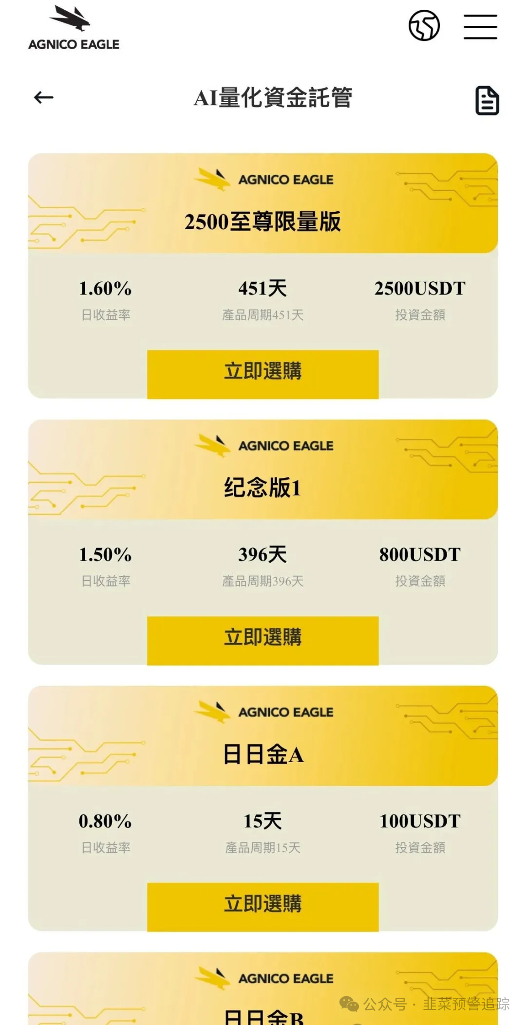 今年3月18日,伊格尔矿业AI量化资金盘上线,打着AI 量化交易、稳赚分红旗号行骗。官网包装似华尔街机构,充斥专业术语,宣称名校、大机构合作及华尔街精英团队。承诺超高收益,月达50%-300%,年化超3000%,所谓AI技术与量化交易皆为虚假。现限制提现,二次收割。望参与者速撤离维权,勿陷骗局!
