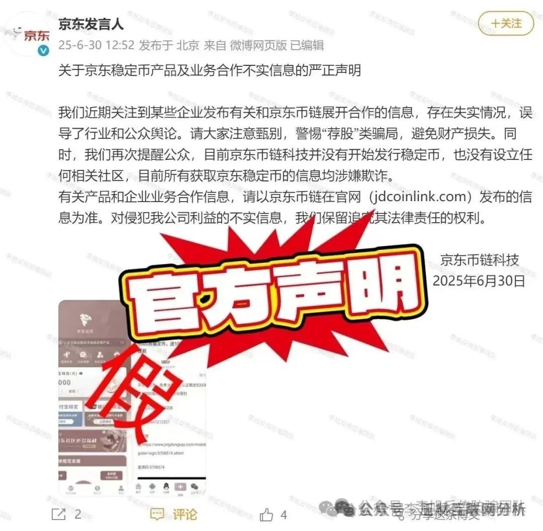 冒充“京东”发行“稳定币”。对此,京东方发布严正声明,并未开始发行稳定币也未设立任何相关社区,目前所有获取京东稳定币的信息均涉嫌欺诈。