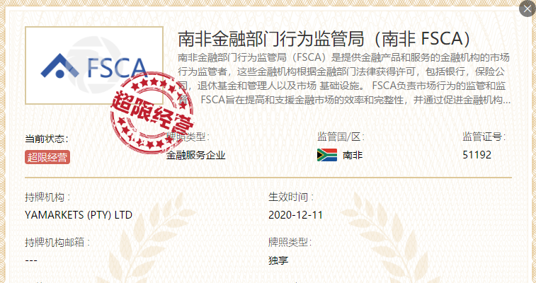监管状态异常:南非FSCA将其标注为“超出(overt)”状态,暗示其可能脱离有效监管范围;而CySEC监管编号对应的公司名称与YaMarkets官网信息存在出入。