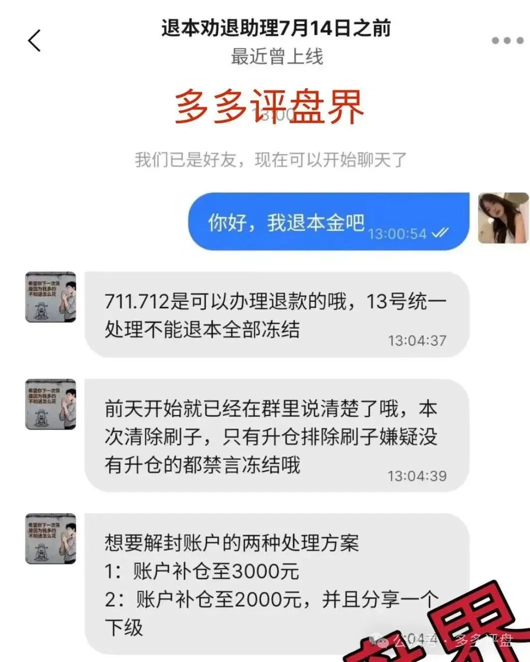 这群骗子的戏码真是越来越荒诞了。先是抛出 7.11、7.12 能退款的诱饵,转头就放话 13 号统一处理、不退本还全冻结,这套说辞在前天就开始在群里铺垫,无非是给韭菜们打预防针。所谓的 “清除刷子” 更是可笑,说白了就是没交钱升仓的全被禁言冻结,这不就是明摆着逼你掏钱吗?想解封?行啊,要么补仓 3000,要么补 2000 再拉个垫背的。这种拙劣的伎俩,明眼人一看就知道是崩盘跑路的前奏。资金盘的套路玩得再花,也藏不住圈钱跑路的本质。先给点甜头钓你入局,等韭菜养肥了就开始收割,最后卷款跑路留下一地鸡毛。现在这套操作,不过是最后的疯狂罢了,就看还有多少人要往火坑里跳。