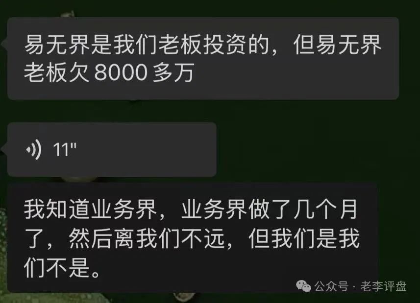 据内部知情人士透露,“易无界”董事长张志良实力并不雄厚,外面欠了8000多个达不溜。
