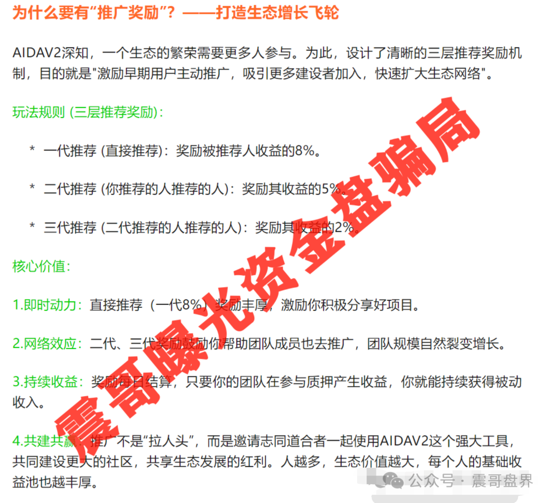 兄弟们,我是震哥,这期曝光AIDAv2的内容很干,一定要听好了。你们要感谢告诉你这是资金盘的领导人,起码他把真相告诉你了。反之告诉你这不是资金盘的,黑心领导人无疑了,你亏不亏钱对于他来说无所谓,他只想要推广的奖金。记住,每个资金盘都不会说自己是资金盘,会进行各种伪装,接下来看看这个项目包装的致命漏洞。