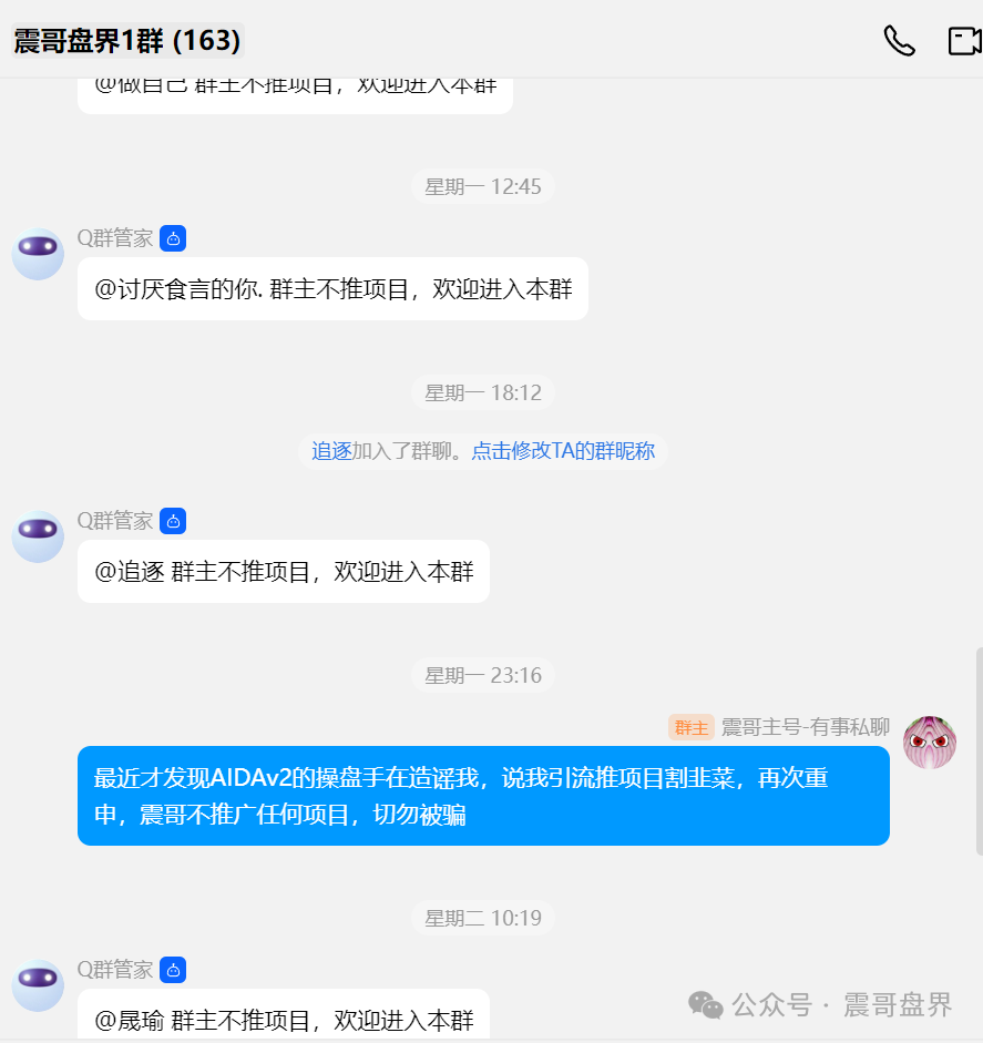 七、震哥前两天才知道AIDAv2的人黑震哥,说震哥引流做项目割韭菜,真的是说谎上瘾。你们不要光听项目方怎么说,有点自己的思考!