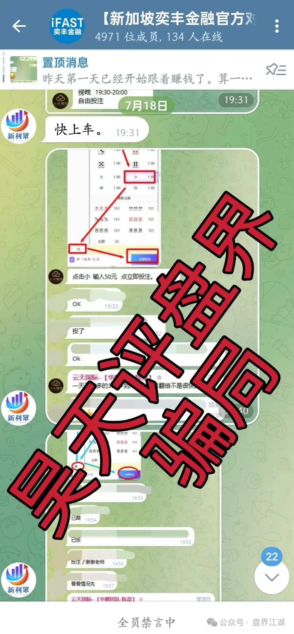 诈骗团伙发布的彩票平移公告如下:现在奕丰那边资金出现问题是没办法转了,大陆政府给的压力,被冻结了,炒股我们是做不下去了,集团也是在办法,给大家处理好,我们是会转做彩票具体的方案,我会这一两天,或者是今晚八点这样就落实下来,然后就是发布了所谓的云天国际彩票的平移方法,开始第三次收割: