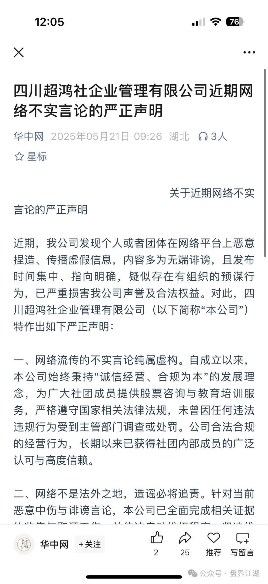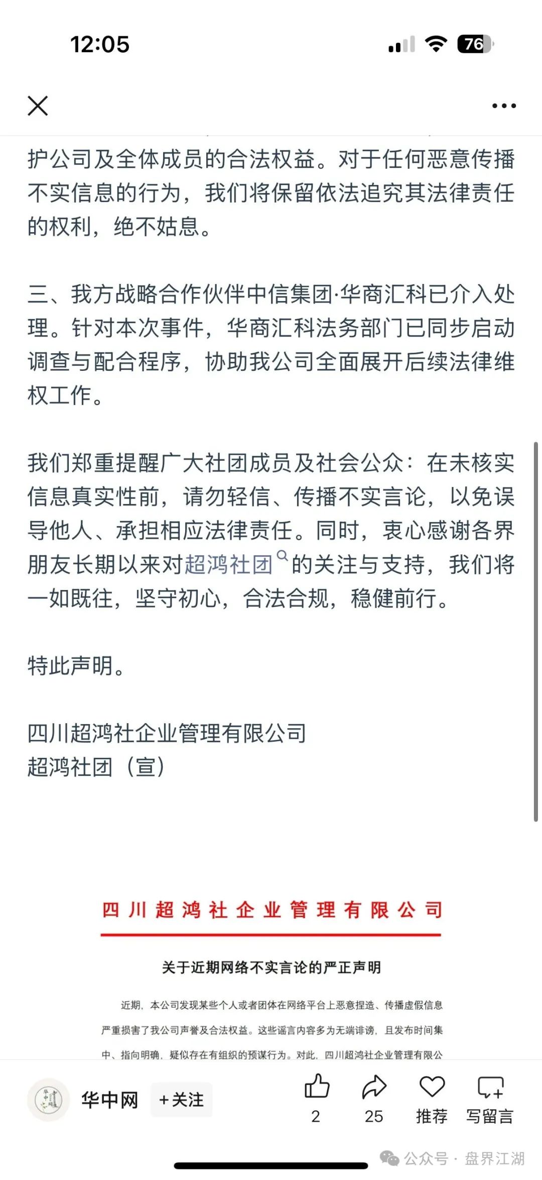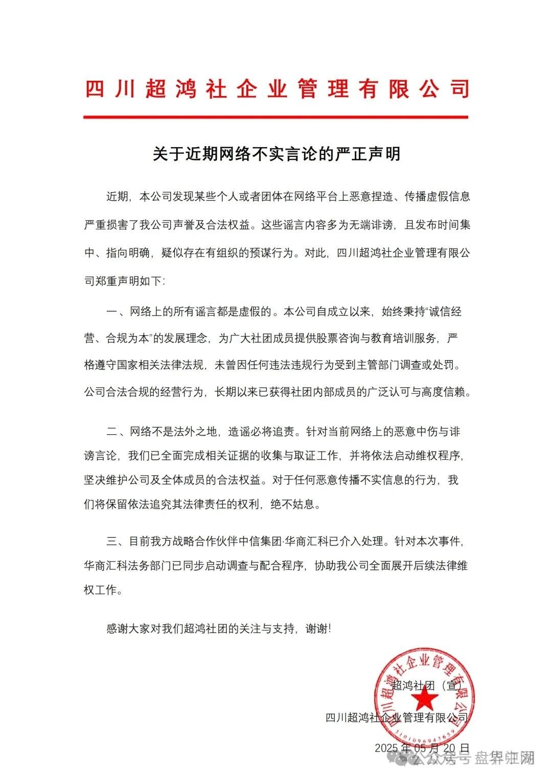 然后再来说说他们包装的四川超鸿社企业管理有限公司,之前还发了一个所谓的声明,声明中写到了“他们为社团成员提供股票咨询和教育培训服务”,把会员资金全部充值到你们自己的app里然后群里带单你告诉我们说你们是正规的?骗傻子?你真是正规的那我们股市散户就不用玩了,几百亿资金都给你就行了哈哈,还能保证月收益90%以上,年收益高达1000%,会员们没事的时候也去警局或者本地反诈中心或者金融管理局问问合不合法,:
