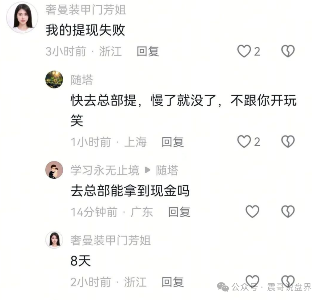 现在艾兴合彻底现原形了,根本提不出钱!震哥早就提醒过这项目有问题,听劝的兄弟早早就撤退了。前两天还有人跟震哥说,直接带着警察冲现场才把本钱要回来。记住了啊,这种盘子的钱都是谁先闹谁吃肉,拖到最后连汤都喝不上!