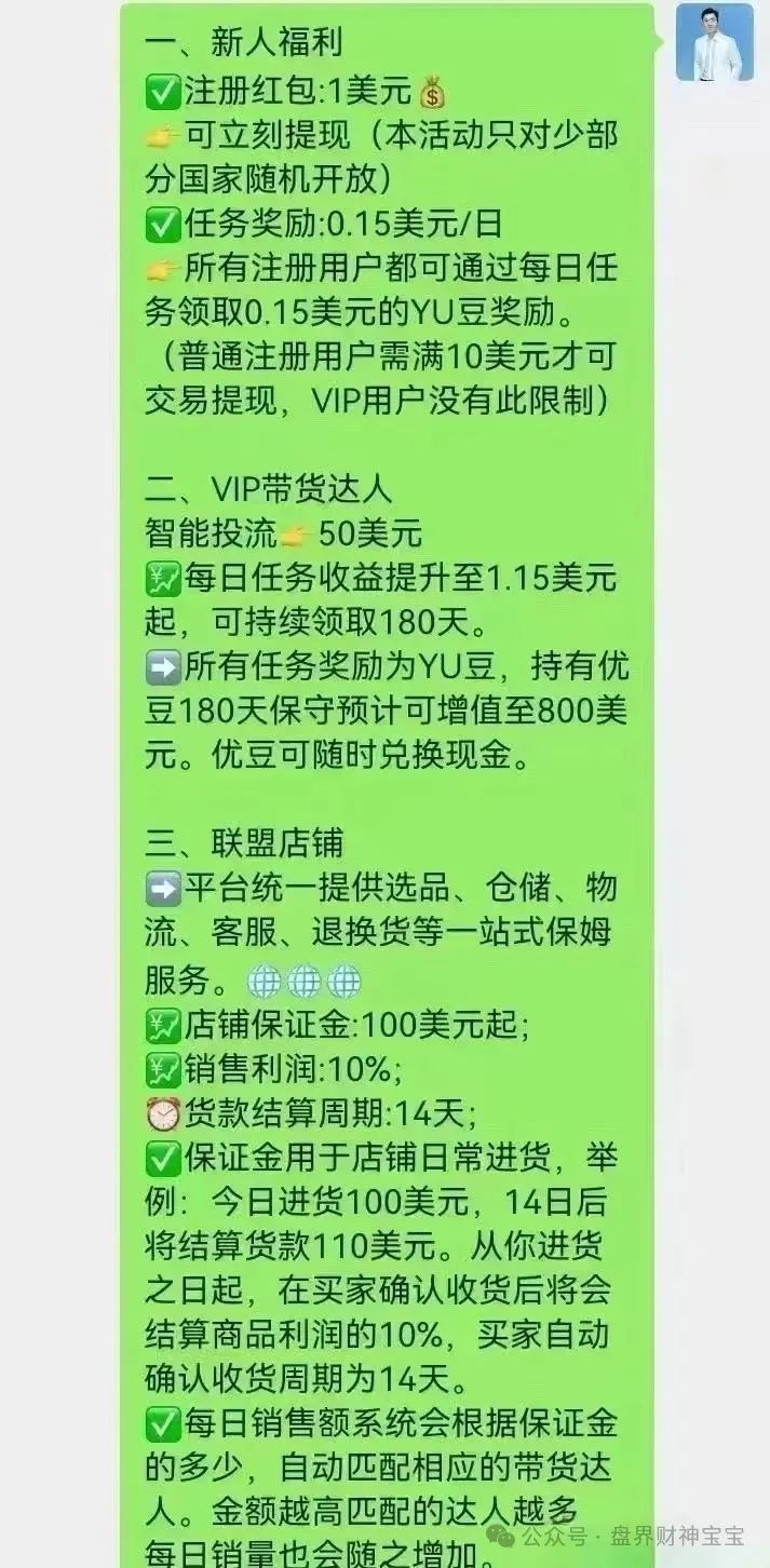 最近在资金盘圈小火的优哩哩,靠着“模式新颖”吸引了不少人带着团队冲进场。毕竟“跨境电商”听着靠谱,哪怕已是红海,可它号称“14天收益10%、月化20%、年化近300%”,用USDT结算,听起来比做什么生意都赚。