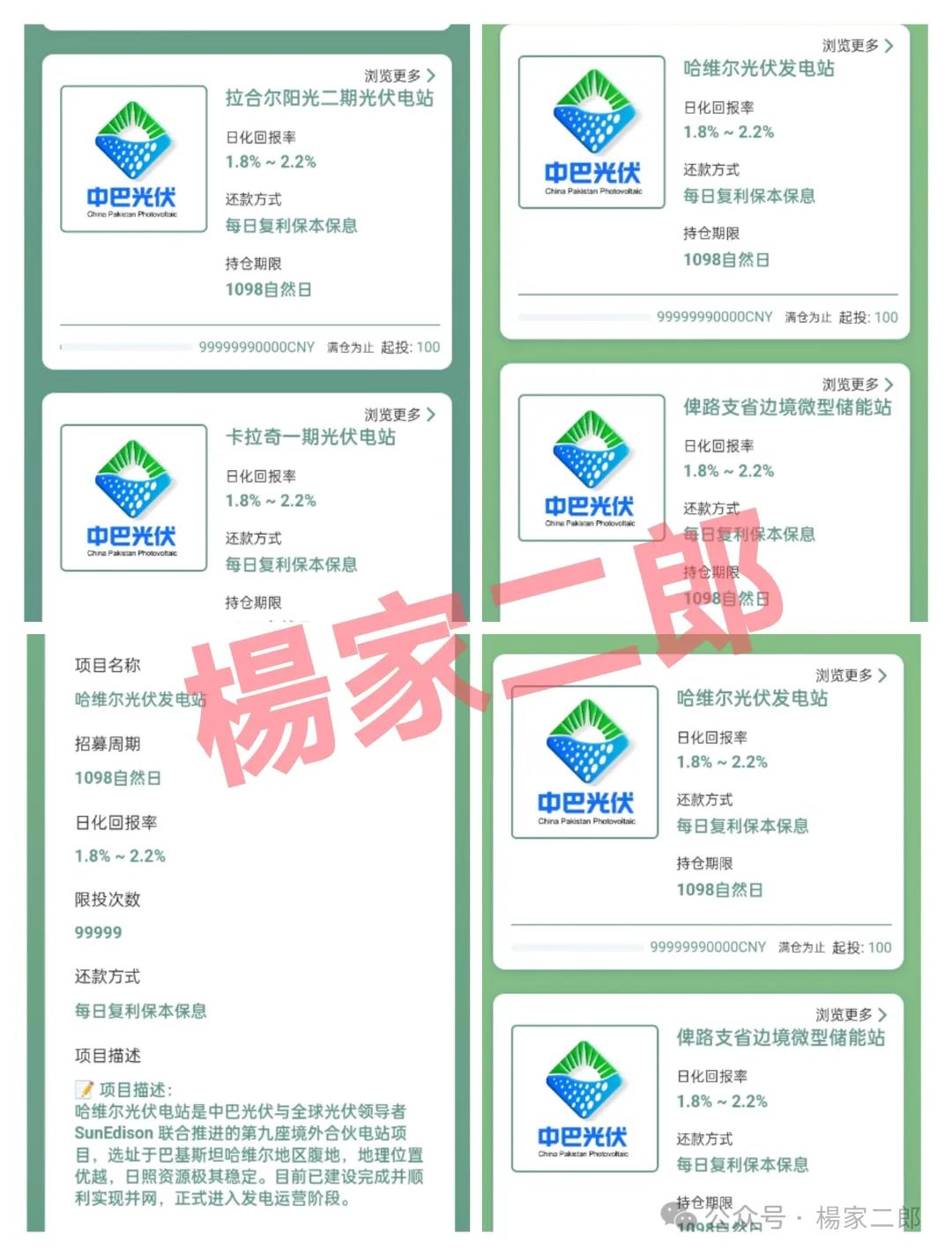 该项目称每度电卖0.8元,但巴基斯坦的电力采购价才0.6到0.72元,且每年还在下调。同时其承诺的收益率过高,日赚1.8%-2.2%,三年复利下来收益惊人,600多万倍的超高收益,而光伏行业是慢行业,讲究长期稳定回报,根本不可能有如此高的收益,明显违背市场规律。印钞票估计都没该项目赚钱的速度快!