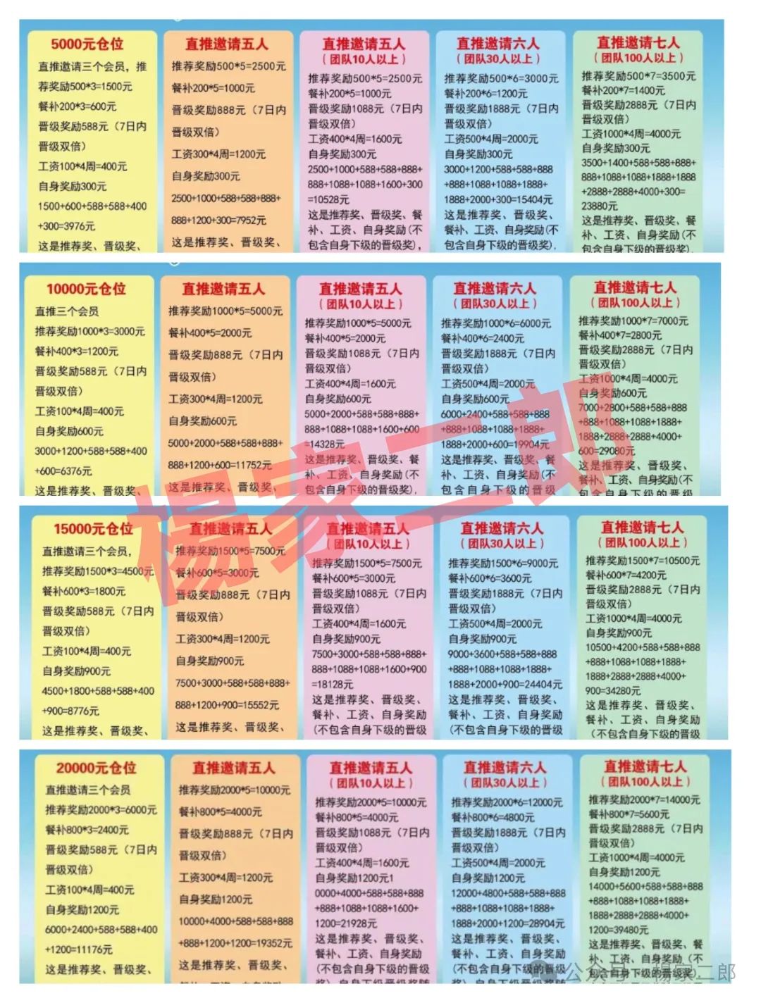 该平台超高动态收益,来刺激吸引参与者拉新。推荐1人可获得投资额10%的“推荐奖”,下线再发展新人还能拿超高的“管理奖”、晋级奖、餐补、周工资自身奖励等众多超高收益,并按照层级划分返利比例。声称“做到区域代理,每月躺赚10万”。参与者该平台赚钱的唯一途径:不断的拉人头进来参与,获取超高动态收益,来达到自己快速回本赚钱目的,除了这样再无第二种可能!