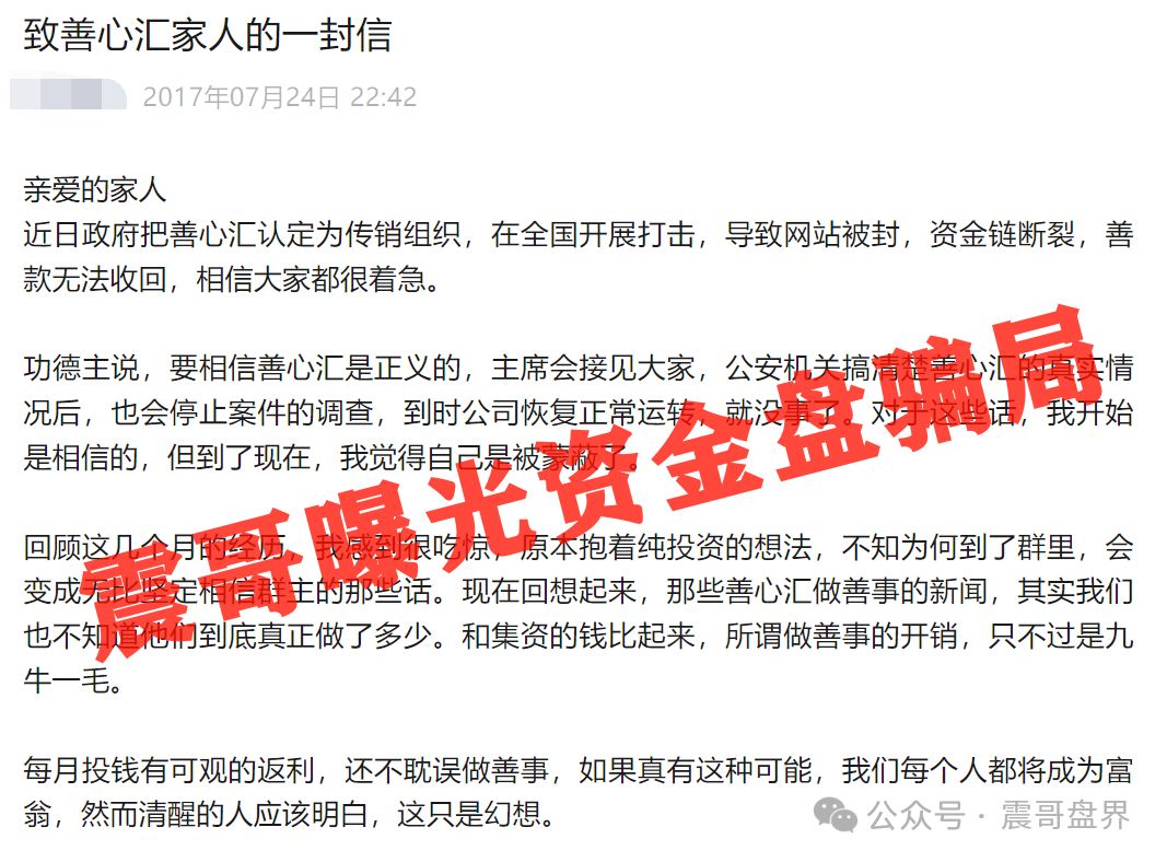 信件中口口称呼会员为家人,震哥曝光的几百个项目,大多数都是称呼会员为家人,震哥可以给大家举一些例子,15年的MMM称会员为家人,最后圈钱几百亿跑路。17年有个资金盘叫善心汇,500多万会员,圈钱几百亿,也称会员为家人,最终结局也是崩盘。再说说最近的圈钱百亿的鑫慷嘉,180万会员,也是称呼家人。