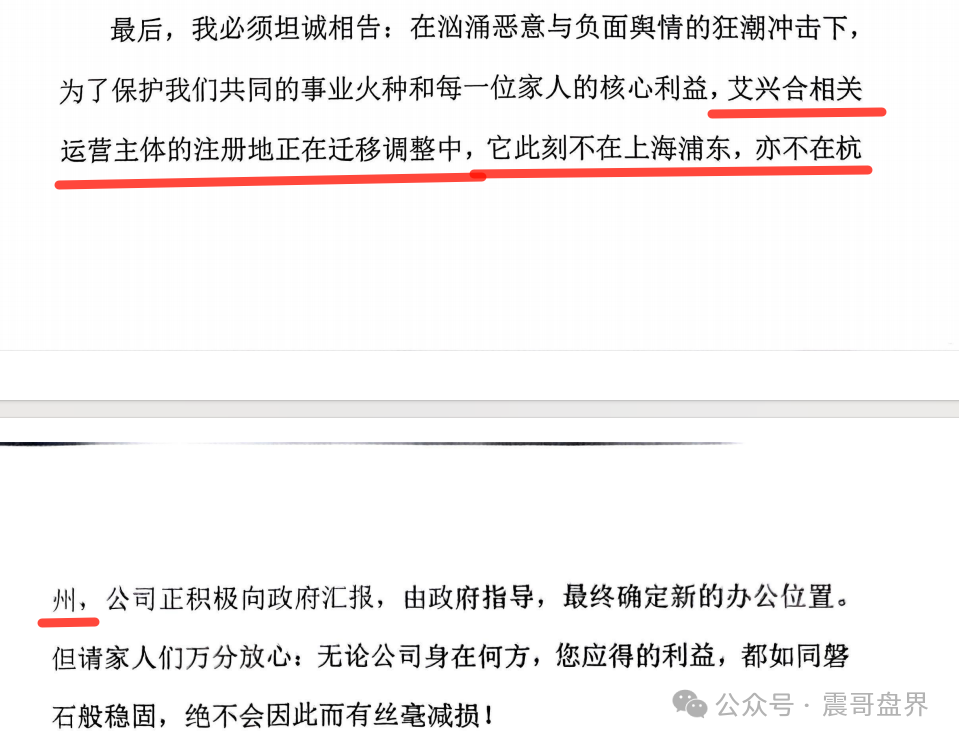 信件中还提到了艾兴合的注册地正在迁移调整中,不在上海也不在杭州,震哥记得艾兴合从4月份就开始搬,然后到6月17号已经完成搬迁了吗?正规公司会这么搬来搬去吗?而且公司没有实际的经营地址已经是违法行为,会员们自己好好想,有自己的思考,不要只听艾兴合怎么说。