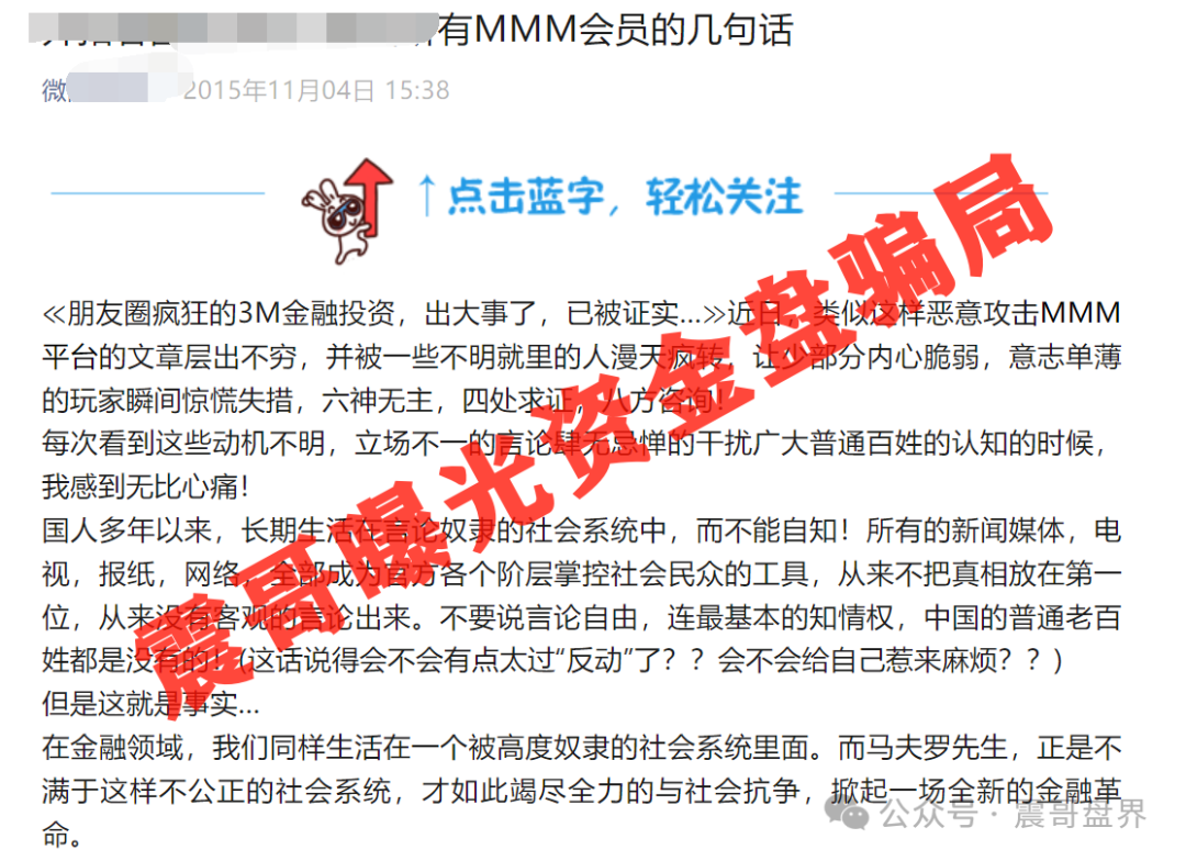 今天震哥收到粉丝消息,说我被艾兴合董事长点名了,就在吴凤勤致全体艾兴合家人的一封信中提到:以“震哥有话说”为代表的自媒体,处心积虑地编织着毒网般的谎言。这真的让震哥团队的人都很受宠若惊,我们自认为还做不到曝光艾兴合的代表,浙江电视台曝光的内容远远比震哥团队曝光的更有公信力。震哥及其团队只是一群公益曝光骗局的人,希望各位会员以官方信息来源为准。