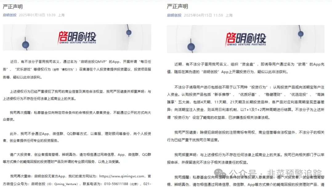 真正的启明创投是2006年成立的知名风投机构,管理资产超百亿美元。但2024年11月出现套牌资金盘,诱导投资者在伪造的“启明创投”App投资。该App虚构绿能、新材等投资产品。启明创投官方四月已声明未开展互联网投资业务,可冒牌项目方加快收割。提醒大家理智分析,远离资金盘,避免踩坑。