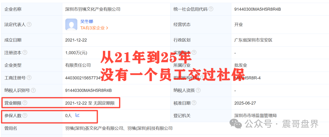 再来扒一下深圳市羽境文化产业有限公司,注册资金1000万,实缴0元,这个公司从21注册到现在才3个员工交社保,意味着这个公司就三个员工,街边奶茶店都比这强,就是个空壳公司(震哥科普,企业不给员工交社保违法!)。