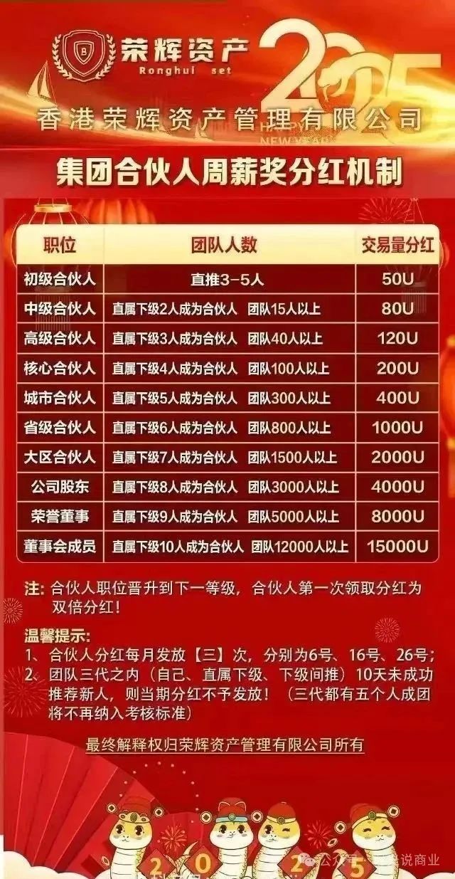 荣辉资产给出的收益率,远超合理范围,如同高悬在投资者头顶的一把达摩克利斯之剑,随时可能落下,斩断他们的财富梦想。除了令人咋舌的静态收益承诺,荣辉资产还推出了极具蛊惑性的动态收益体系。