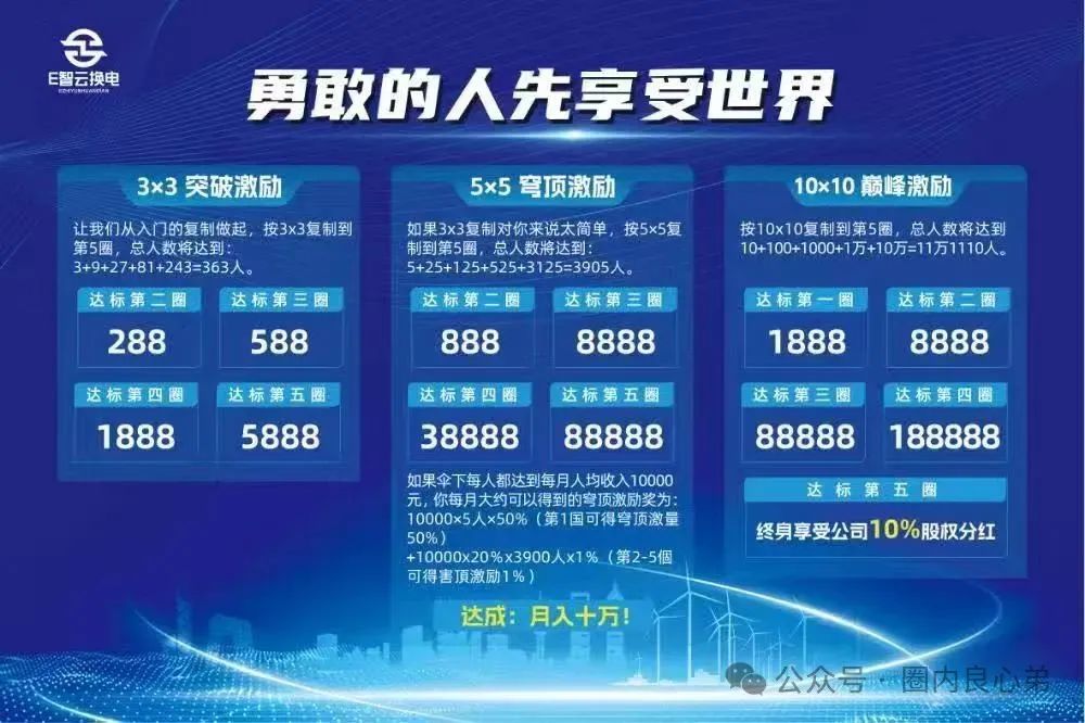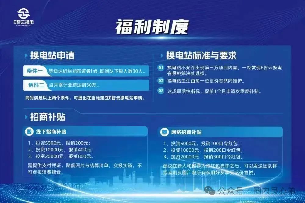 最近良心弟后台常有粉丝留言,咨询一个台字叫”E智云换电“平台,说说某博主还为该项目宣发,在良心弟看来打着新能源的外衣,做骑手换电的项目,用户只需要投资该平台可以实现躺赚神话,真的有这么好的事情吗?我想摸着良心说,并没有这么好的事,所谓的换电都是一场彻头彻尾的骗局罢了,还在参与其中或者投资该项目注意警惕吧,其手法与近期多地爆雷的中基绿能、涤旧能源,骗局如出一辙——以新能源之名行金融诈骗之实,目前已经在个城市开始肆意掠夺非法集资,接下来良心弟也就按照几个逻辑来讲解该项目的诈骗资金盘的本质。