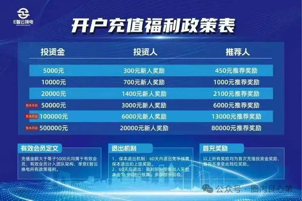 最近良心弟后台常有粉丝留言,咨询一个台字叫”E智云换电“平台,说说某博主还为该项目宣发,在良心弟看来打着新能源的外衣,做骑手换电的项目,用户只需要投资该平台可以实现躺赚神话,真的有这么好的事情吗?我想摸着良心说,并没有这么好的事,所谓的换电都是一场彻头彻尾的骗局罢了,还在参与其中或者投资该项目注意警惕吧,其手法与近期多地爆雷的中基绿能、涤旧能源,骗局如出一辙——以新能源之名行金融诈骗之实,目前已经在个城市开始肆意掠夺非法集资,接下来良心弟也就按照几个逻辑来讲解该项目的诈骗资金盘的本质。