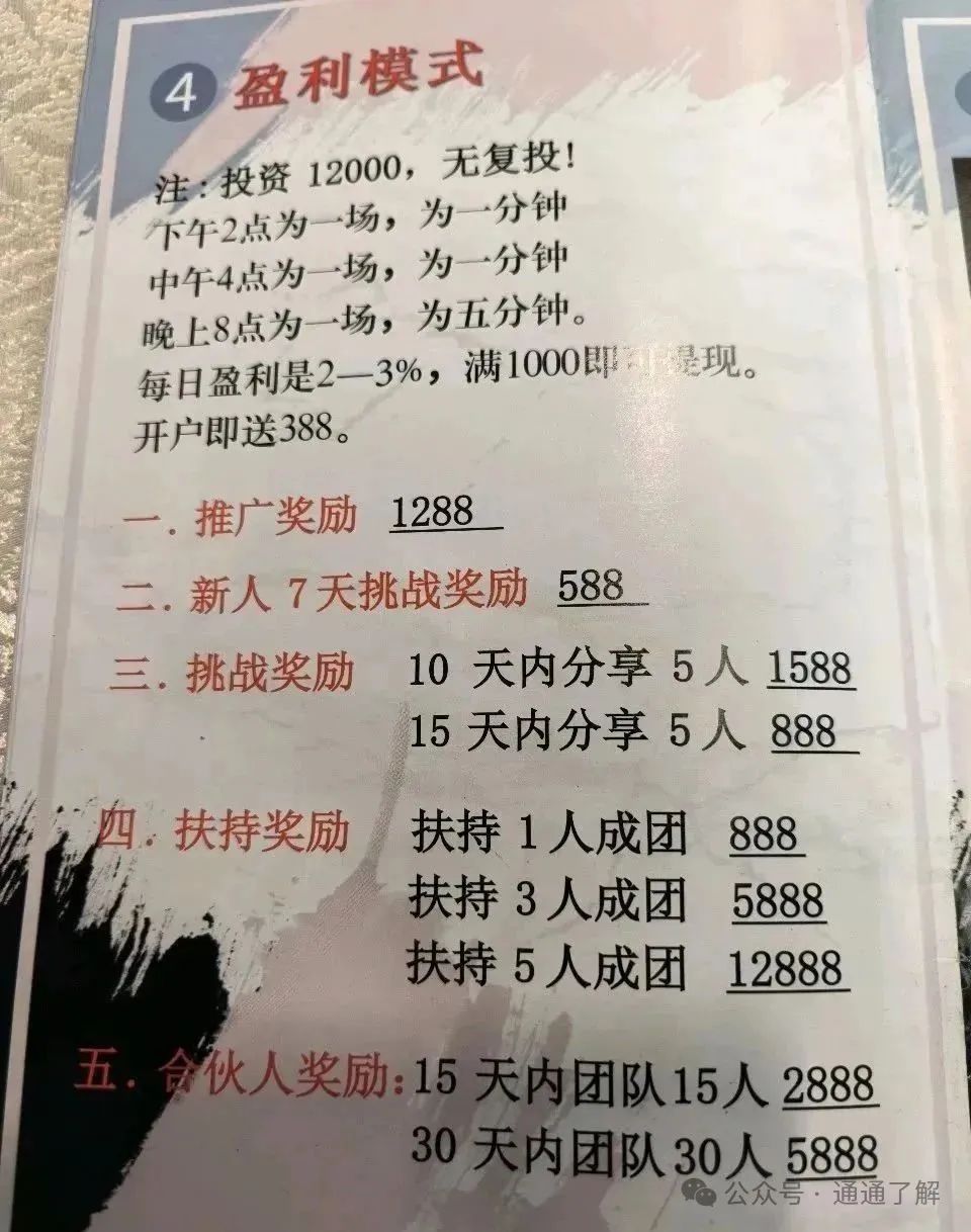 ◦ 五级传销架构:设置“合伙人→区域代理”等级,拉1人奖励投资额10%-15%,团队业绩达标再分红,本质是“拆东墙补西墙”的庞氏骗局 。