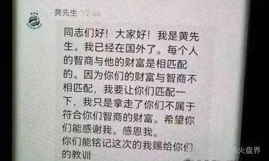 最后提醒各位:趁着现在还能提现撤离,就赶紧撤,别到最后血本无归了,还要收到一条类似鑫慷嘉操盘手“黄先生”的退场声明:“因为你们的财富与智商不相匹配,我要让你们匹配一下,我只是拿走了你们不属于符合你们智商的财富。”充满了嘲讽与嚣张祝福。