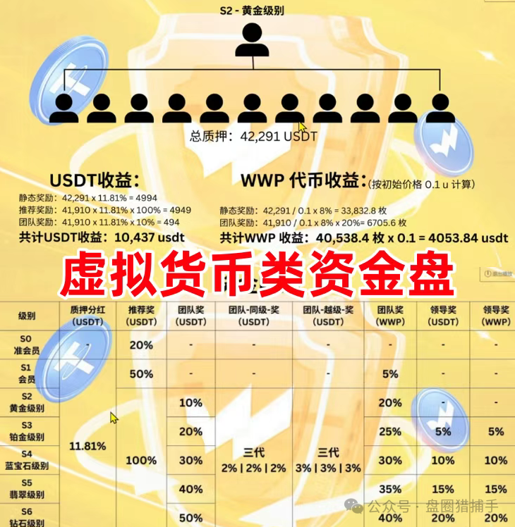 WWP虚拟币以区块链质押为名,宣称381元起投,月息11.81%(年化141.72%),赠等额WWP代币,另设直推奖、三代同级奖、超级奖等团队收益,实为传销式资金盘。平台无合法金融资质,代币无实际价值,靠新投资者资金支付旧人利息,属典型的“借新还旧”庞氏骗局。宣传“外国公司背书”、精美白皮书皆为伪造,难在权威渠道核实。提现常遇“系统维护”或需额外投资、拉人头,预示跑路前兆。受害者多因贪图暴利忽视风险,平台崩盘后血本无归。建议立即核查项目资质,保存转账记录、聊天截图,拨打110报警!
