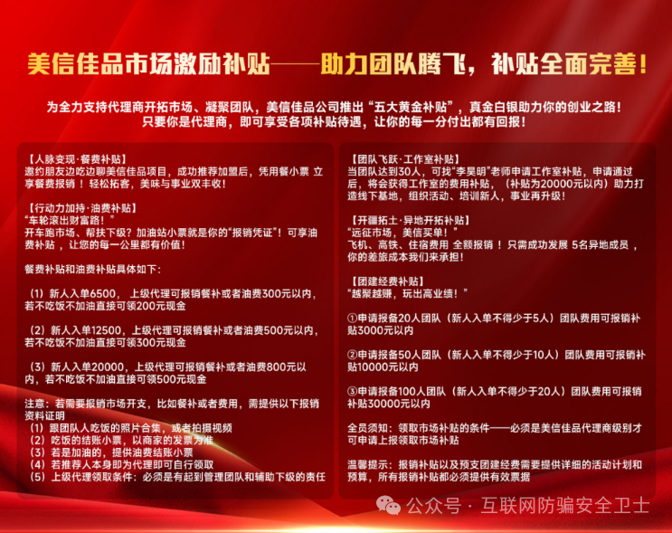 再看美信佳品的模式,懂的人都懂。美信佳品要求参与者缴纳 6500 元起的 “加盟金”,并通过推荐新人获取奖励,具有“缴纳入门费”、“拉人头”、“团队计酬” 的特征。