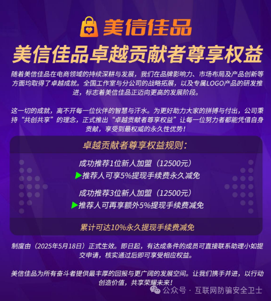 2025 年 3 月成立的美信佳品电子商务有限公司,宣称独创 “多方商业循环体系”,主打 “电商 + 理财” 双模式。其投资模式极具迷惑性: