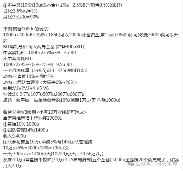 上面就是这个“帝亿交易所”的模式制度玩法介绍,各位自己看吧,暗火就不多讲解了,因为太乱了,看着就像大杂烩,卡牌、盲盒、拼团、挖矿什么的都有,给人的感觉是硬把几个资金盘模式容入一个项目里一样。在这里弱弱的问一句,是不是股东的意见不一致?每人都想整一套模式,最后没办法才全部塞到一个项目里的吧?估计那些上了50岁的都看不明白,大道至简这么简单的道理都不懂,玩法越简单越好。