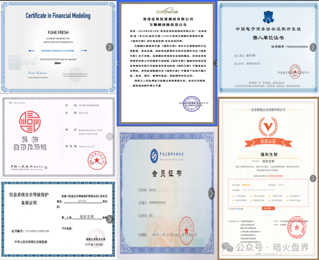 这是今天要讲的“福和优选”的资料介绍,也叫福和生鲜,各位自己看吧,暗火就不多说了,其实也没什么可以说的,都是杀猪盘老套路,就是编造谎言,至于那些证件资质,舍得花钱就买,不舍得花钱就P图,有些人是专门吃这碗饭的,几千一万就能搞一套证件资质,像亚盟联盈和众海联盟这种就是花钱买的。
