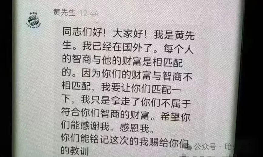 前段时间鑫慷嘉的操盘手“黄先生”跑路后,发的退场声明太经典了:“因为你们的财富与智商不相匹配,我要让你们匹配一下,我只是拿走了你们不属于符合你们智商的财富。”这段话充满了嘲讽与嚣张,但却是事实。