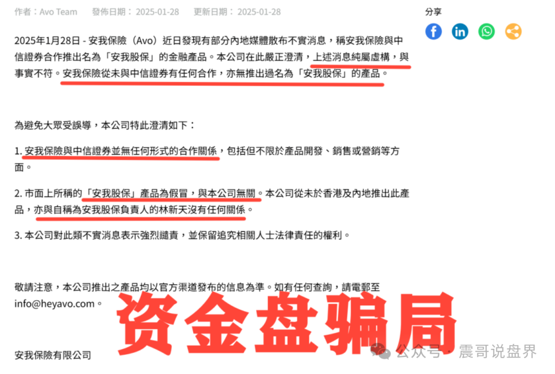 先看安我保险甩出的实锤——1月28号他们官网直接甩出公告啪啪打脸:第一,压根没跟中信证券搞过合作;第二,网上吹得神乎其神的"林新天"跟公司半毛钱关系没有;第三,所有宣传都是骗子团伙自导自演。说白了这就是个空手套白狼的杀猪盘!