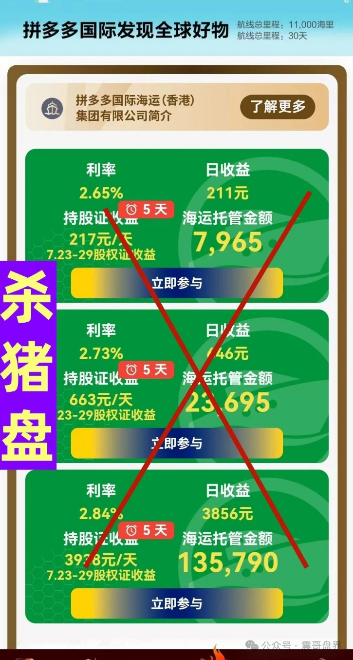 震哥查了查,拼多多官方早就发过声明,压根没搞过什么“国际资金盘”,全是骗子冒名顶替!这玩意儿一看就是杀猪盘,年化收益敢吹1000%,连专业搞资金盘的都摇头——泡沫这么大,不崩盘跑路才怪!