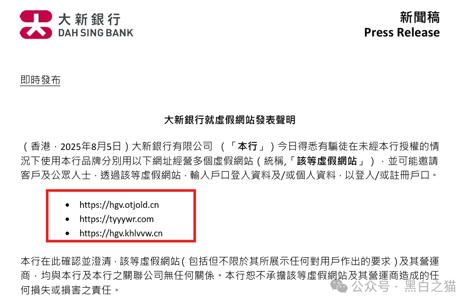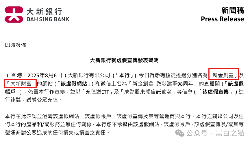 2025年8月5日,大新银行官方通过官网,微信公众号,视频号、抖音、小红书等媒体渠道连续发布严正声明。