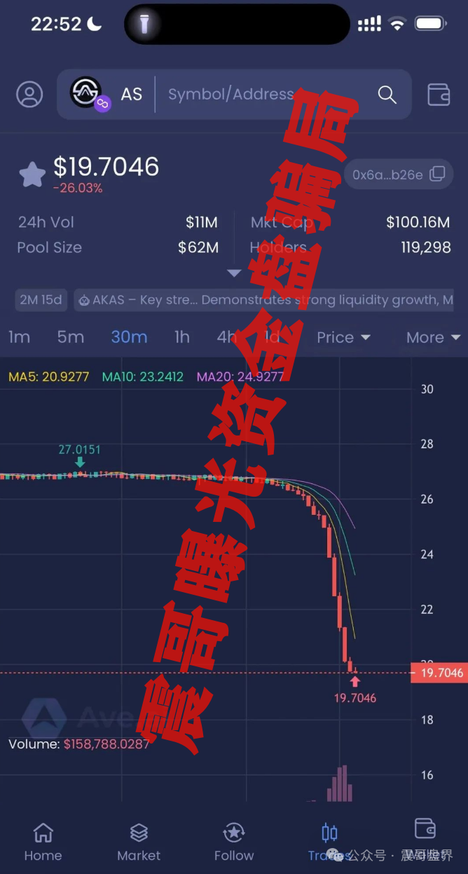 AKAS这玩意儿昨天刚预警就直接暴跌26%,震哥一看就知道不对劲——操盘手偷偷出货,大户团队集体撤退,现在这走势跟跳楼似的,离归零就差临门一脚了!连币安也发布了相关通知。