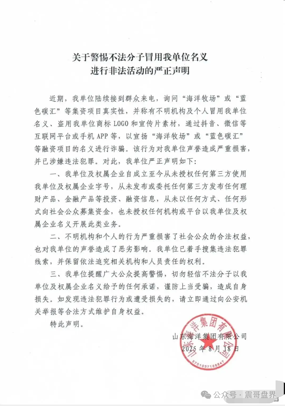 再来回顾下前两天震哥刷到山东海洋集团有限公司发了证明,主要内容有两个,一是海洋牧场冒用名义、盗用商标等进行宣传。二是该融资项目是诈骗并且涉嫌违法行为。请看下图