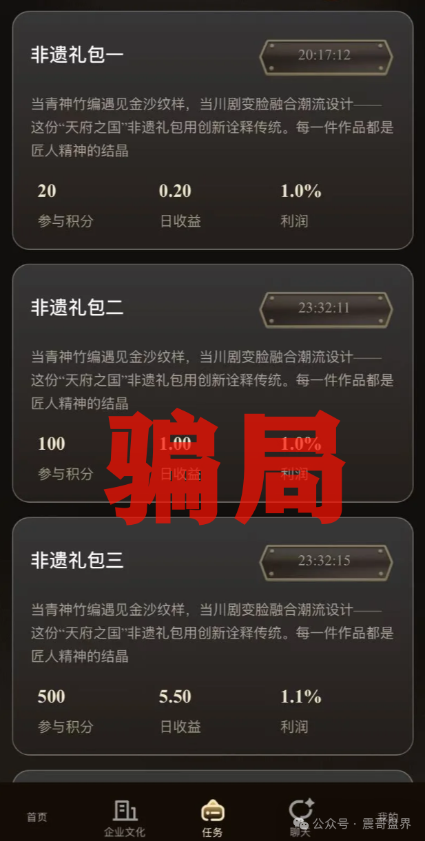 最近有个叫"唯遗"的平台特别火,震哥我一看就觉得不对劲。这帮人打着非遗数字化的旗号,搞的却是资金盘那套把戏,今天必须给大家扒个干净。