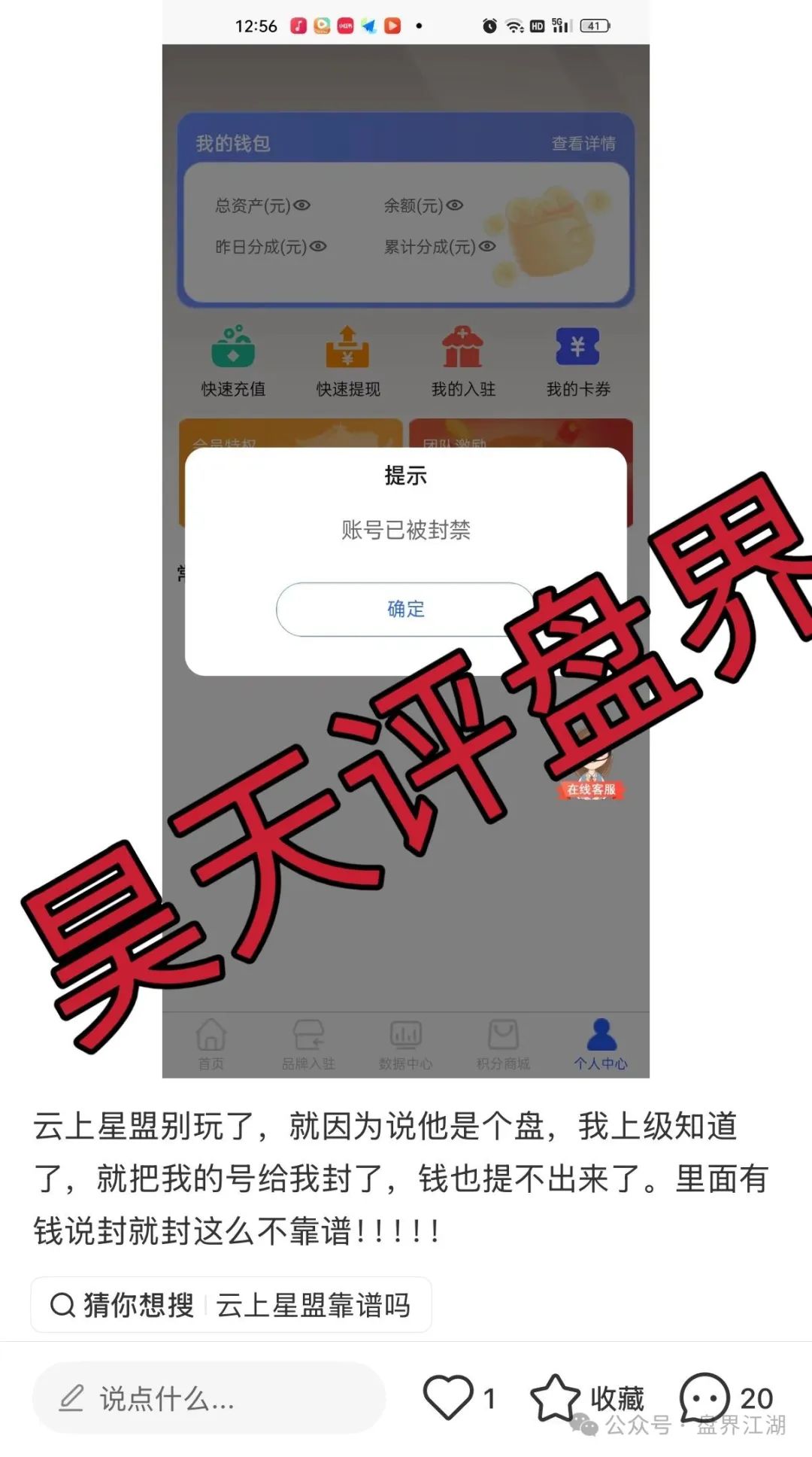 昊天评盘界:这几天不少粉丝给昊天爆料了一个叫云上星盟的分红类资金盘骗局,目前已经开始单割,随便封会员账号,高度预警,你还敢玩吗?包装的模式就是做的所谓的线上加盟线下实体门店...
