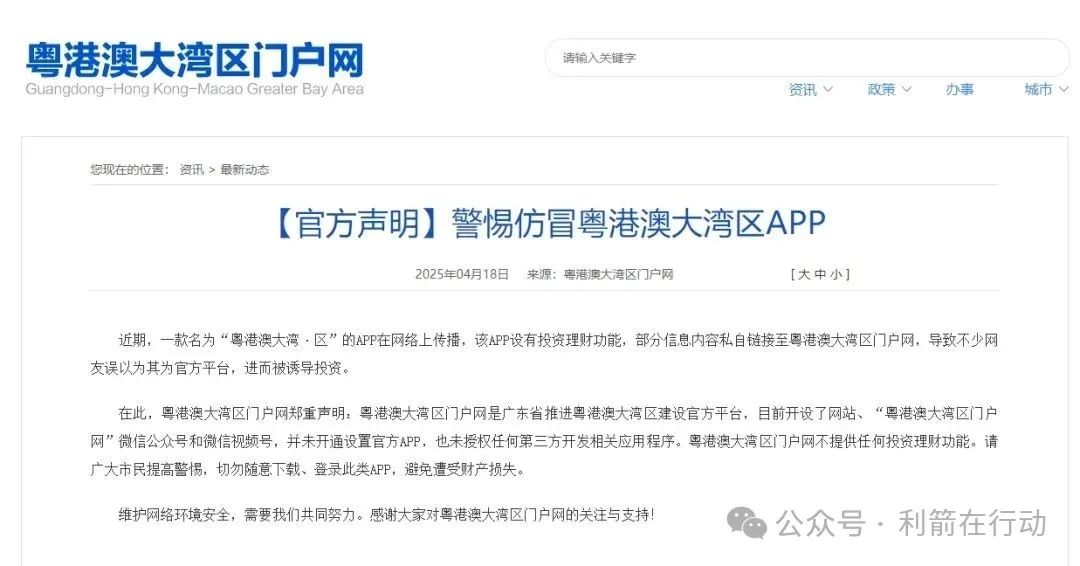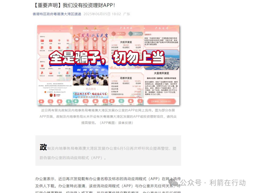 :“香港特区政府粤港澳大湾区速递” 微信公众号发文《【重要声明】我们没有投资理财 APP!》,再次强调官方从未推出此类理财 APP,直接点名 “粤港澳大湾区 APP” 是诈骗。