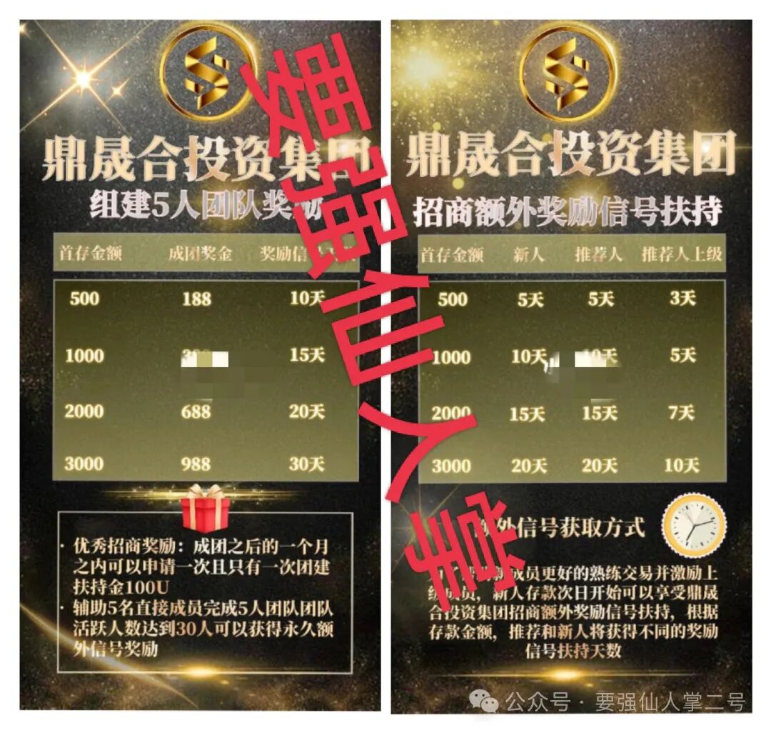 3. 激励机制:拉人头分成+团队佣金收益来源完全依赖“发展下线”,而非所谓“合约跟单盈利”,具体奖励模式包括:- 直推奖励:每直接推荐1人加入并投资,推荐者可获得固定奖励(如一定数量USDT或现金返现);- 团队佣金:根据自身等级和团队总投资金额/人数,按比例抽取团队成员的“跟单收益”或投资本金(等级越高,分成比例越高,如“元帅”可抽取团队总收益的2%);- 等级津贴:达到对应级别后,可领取固定月薪津贴(仿“鑫慷嘉”高层薪资模式,如“军长”月薪数万元,“元帅”月薪可达10万元以上)。