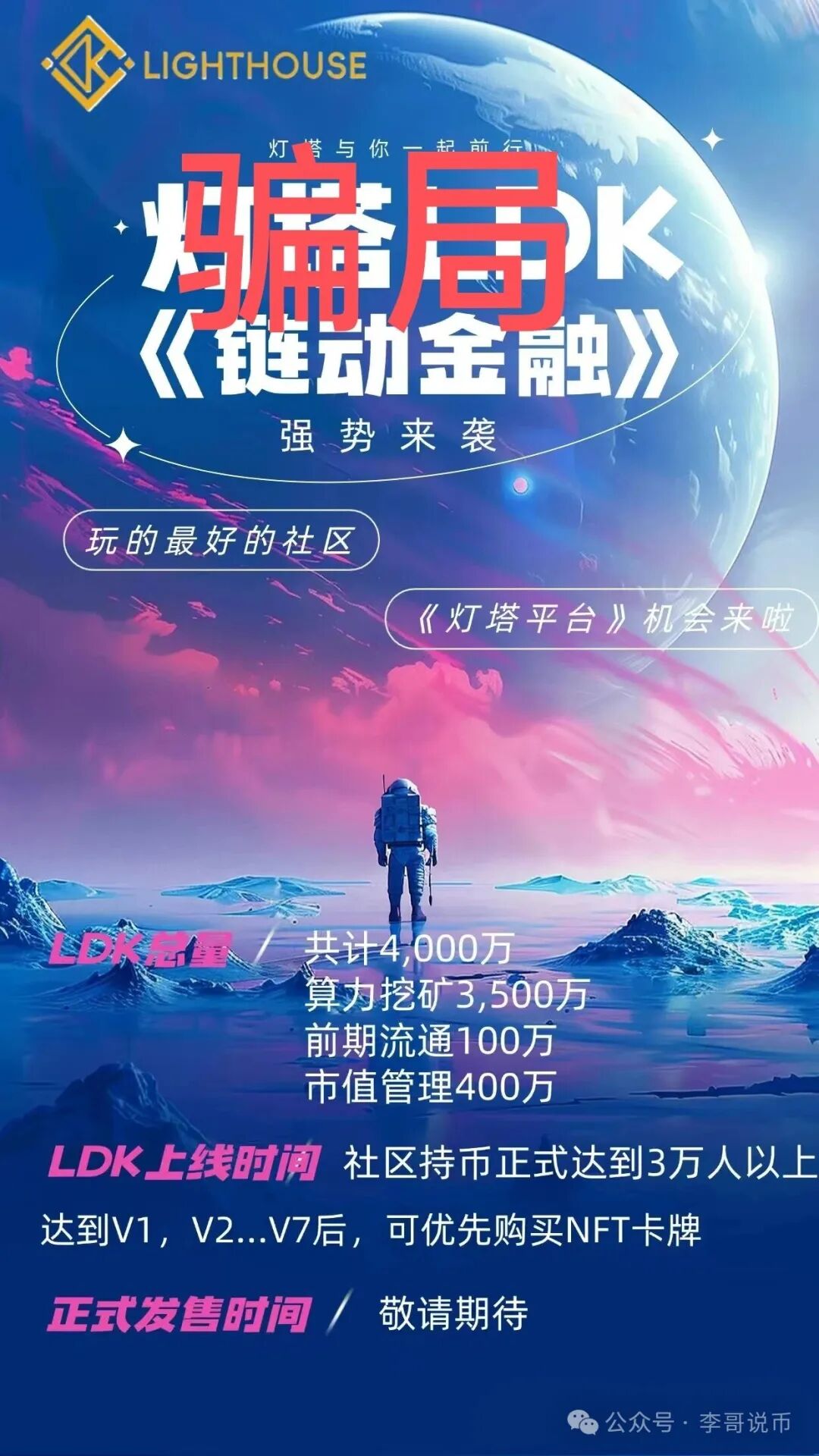 最近,又一个资金盘骗局LDK灯塔在圈内疯狂推广,宣传视频里“老师”们口沫横飞地宣称:“日入四位数五位数”、“一年七位数打底”、“100%零泡沫,不关网,无资金池,不担心跑路风险”。明眼人一看就知道是骗局,为什么还有那么多人趋之若鹜?真相让人心寒:推广LDK灯塔的这些团队,很多正是当年推广PlusToken、雷达币、华英会、分头趣、MANA3的“老面孔”!他们不是不知道这是骗局,而是高收益和一夜暴富的诱惑太大了!