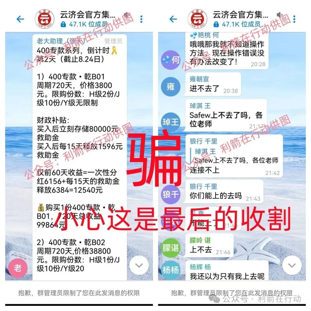 此外,云济会诈骗群正不断鼓动参与者缴纳费用购买所谓 “专款” 产品,这是典型的 “杀猪盘” 敛财手段。目前,云济会 APP 已出现关网跑路的迹象,请所有相关人员立即停止充值缴费!面对疑似诈骗项目,务必秉持 “闻风而逃” 的警惕态度,及时止损。