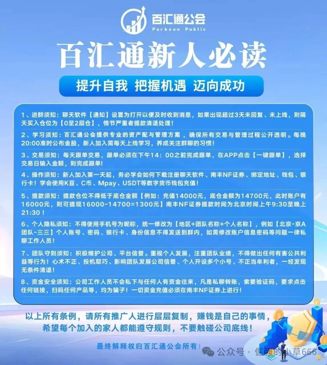 第一,这不是危言耸听,而是正在上演的现实剧本。近期,一款名为“佰宜康《百汇通公会》”的所谓“股票智能跟单”平台,正以惊人的速度收割投资者血汗钱。据大量用户反馈,平台已开始大规模限制提现、封禁账号,尤其是那些不再拉人头的“静态会员”,几乎全部被“单割”——钱锁在里面,进退两难。更令人瞠目结舌的是,这个平台的操盘手,竟与此前轰动一时的“国财资本”系出同门,连包装的“金牌导师郝立本”都原封不动地“复活”登场。这哪是投资?分明是同一群骗子,换了个马甲,继续割韭菜!
