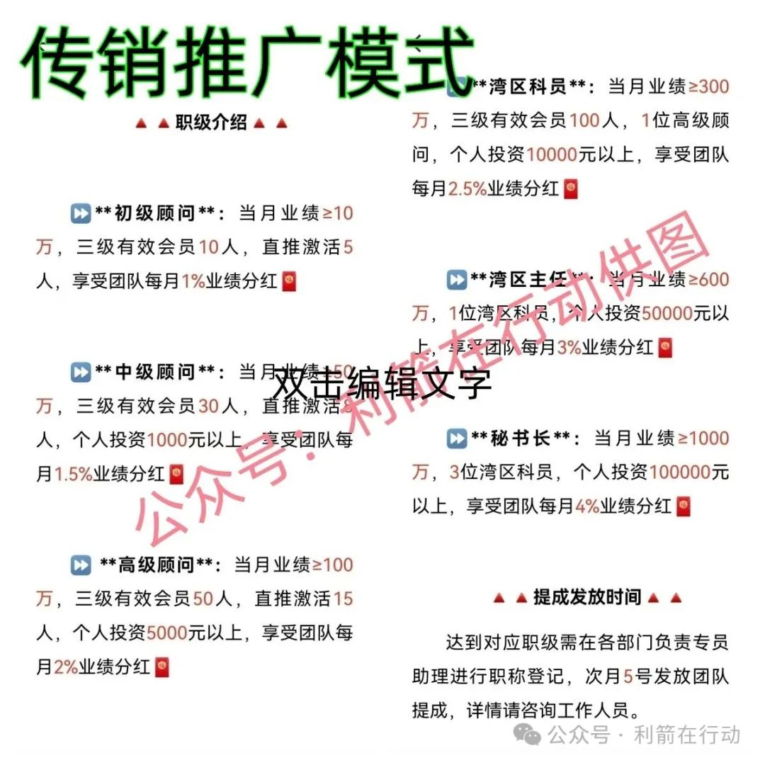 :采用 “拉人交钱、组建团队、层级计酬” 模式,明面上是三级推广,实则可发展无限层级下线;还设置 “初级顾问、中级顾问、高级顾问、科员、主任、秘书长”6 个职级,每个职级均有下线人数要求,完全符合传销的核心特征。