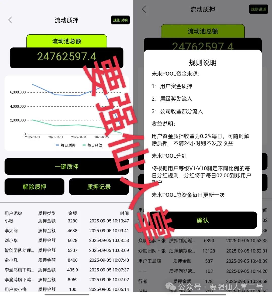 除了AI算力,平台还推出“未来pool质押”业务,宣称日化收益率0.2%。随进随出,底池上面金额都是一眼假,刚上线底池就有2千万美金,明显是项目方撒的诱饵,看似稳健,实则是另一种陷阱:即便质押半年,实际收益微乎其微,而投入的本金如同“丢进水里”,平台一旦跑路,投资者不仅赚不到收益,甚至会血本无归,且因前期收益不明显,亏损时往往反应滞后,维权难度更大。